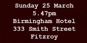DATE : Sunday July 14th – From 7pmLOCATION : The Birmingham Hotel, 333 Smith Street, (cnr Johnston Street) Fitzroy